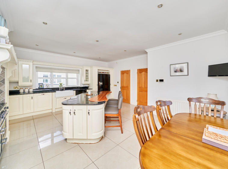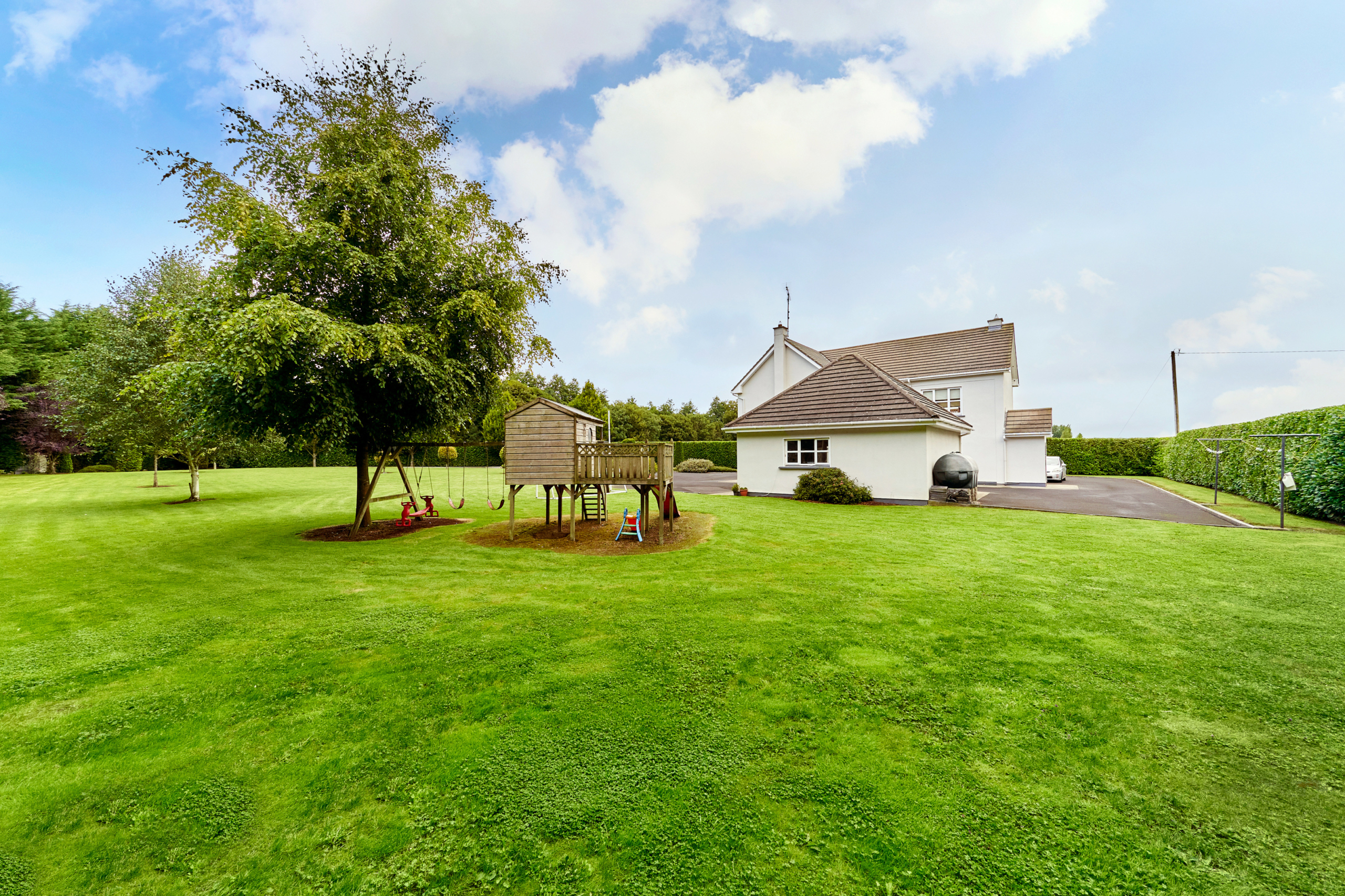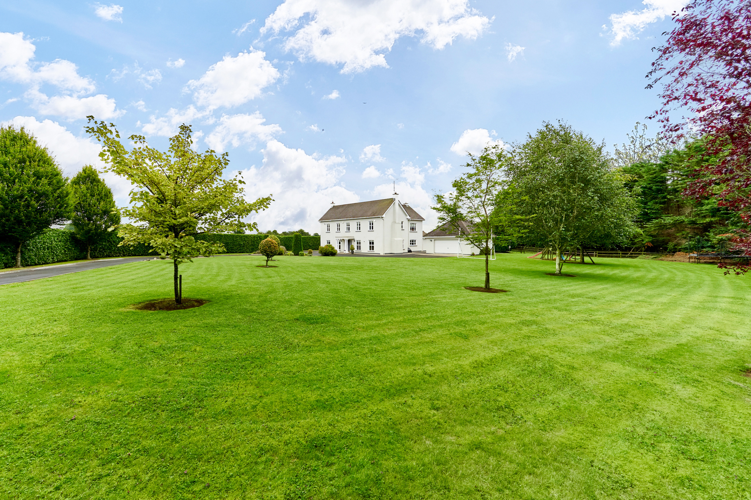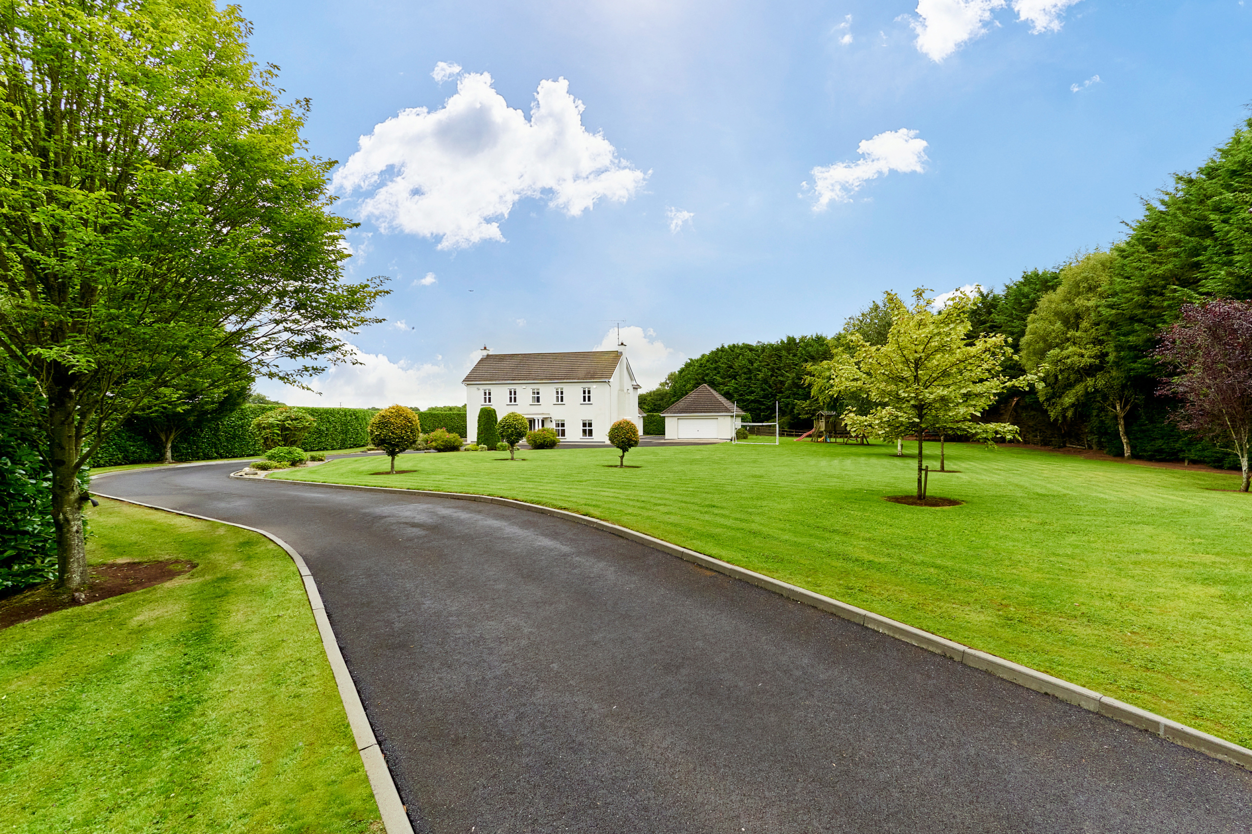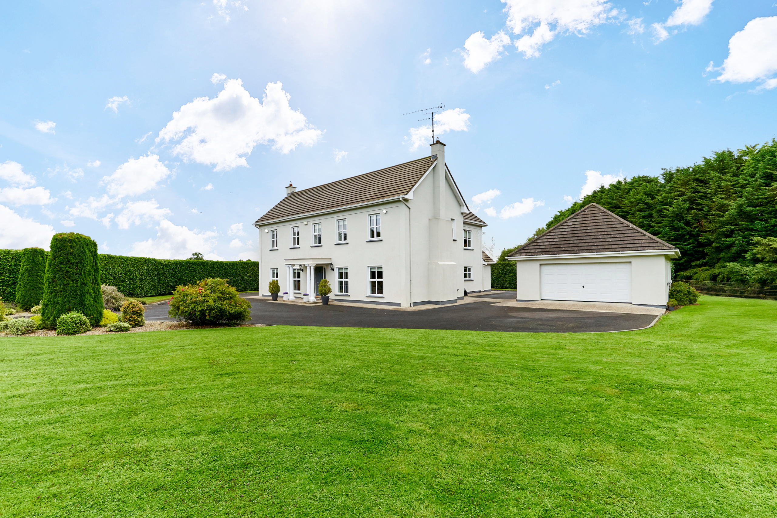 Standing on magnificently landscaped grounds extending to c. 1 acre, this is a charming and secluded spacious five-bedroom detached residence with detached garage. It enjoys wonderful privacy, bordered by mature trees, laurel hedging with beautiful views over the surrounding countryside and Co. Meath golf club. This home is exceptionally well presented both inside and out.