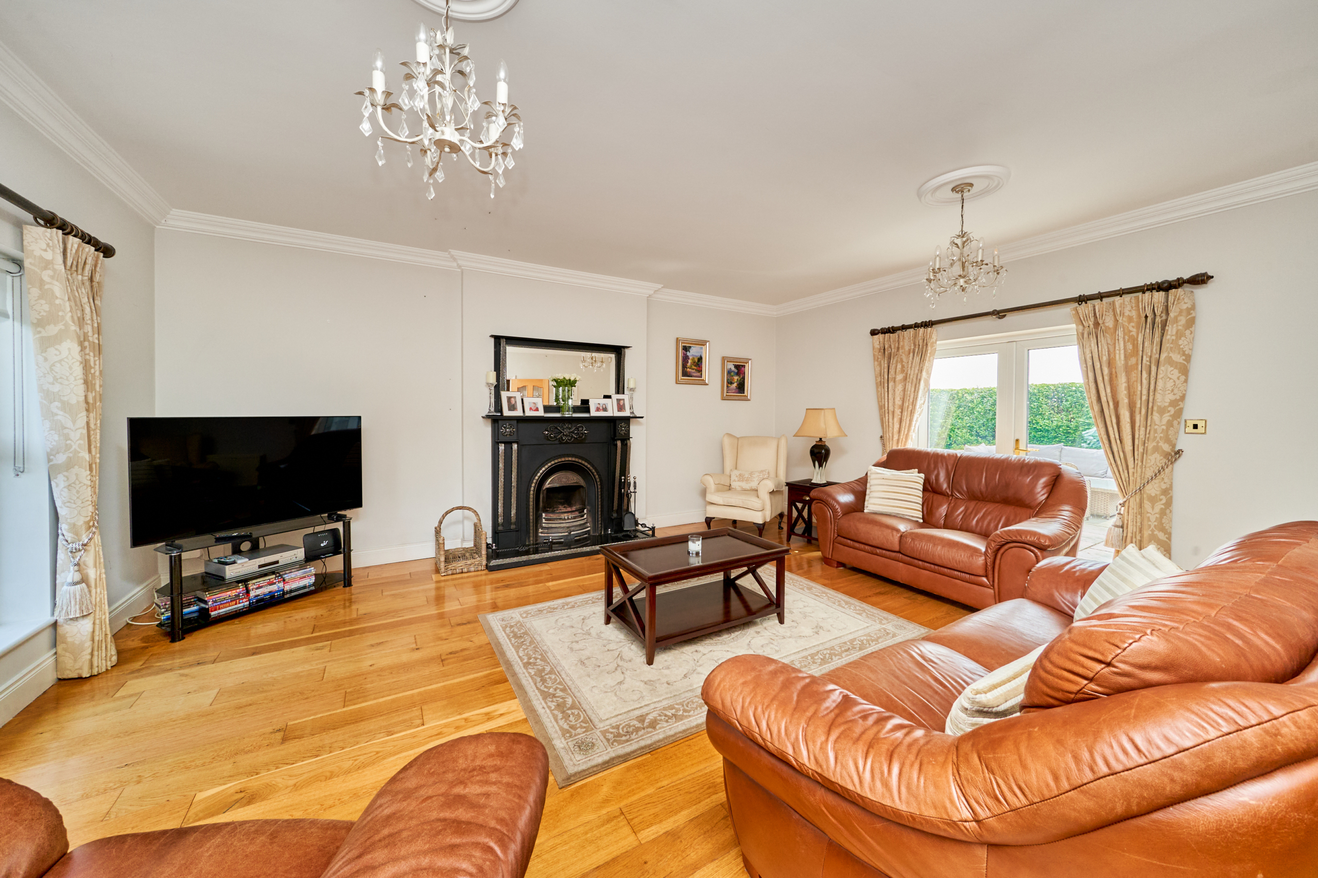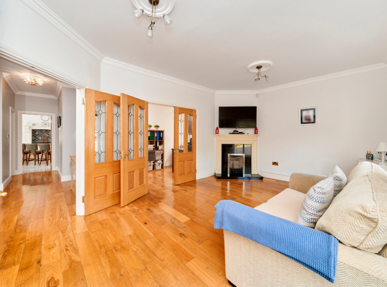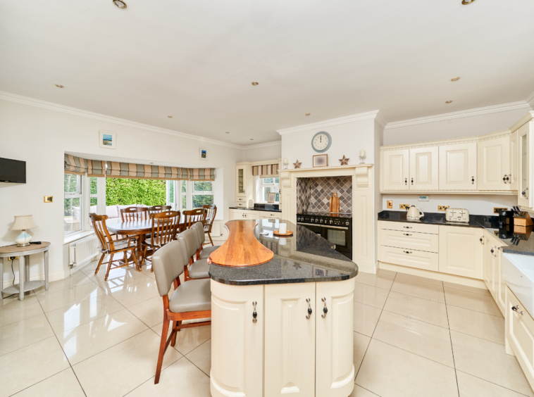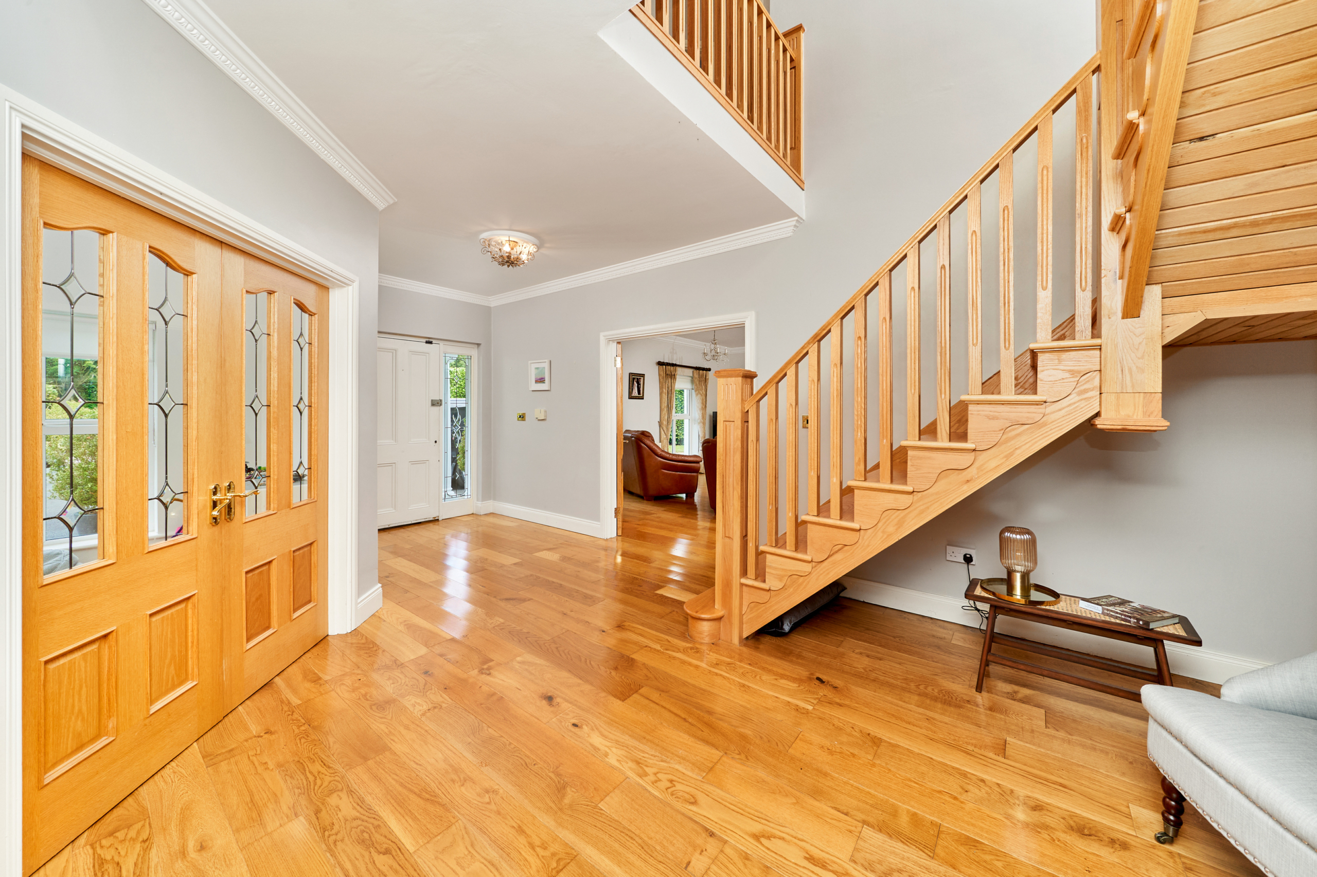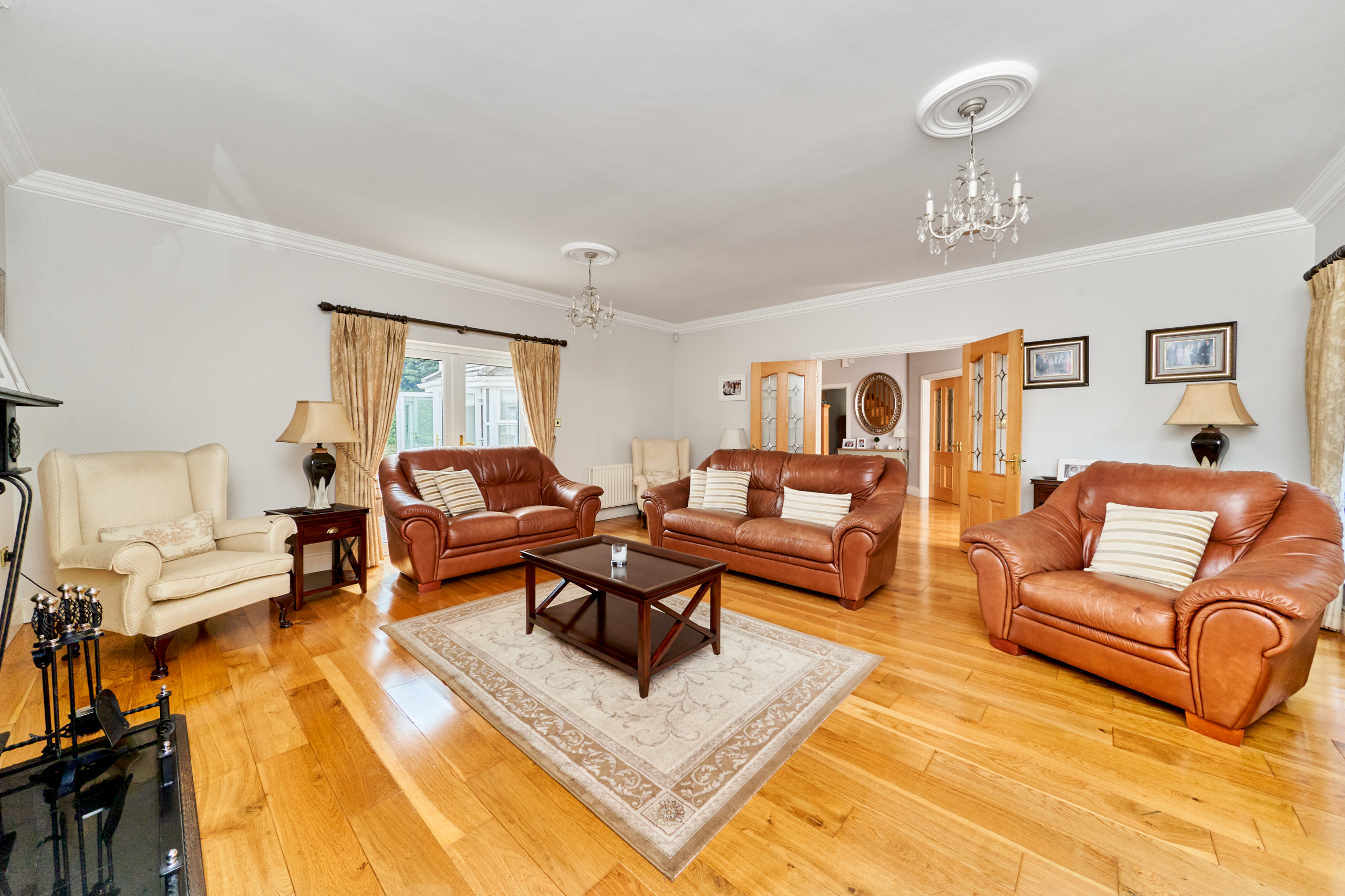 On entering this charming home, the spacious reception hall sets the tone and gives a flavour of what is on offer inside, with solid oak flooring and tasteful decor. Double doors lead to a large sitting room on the left, overlooking the front gardens and with French doors to a paved terrace area. An ideal room for entertaining and enjoying the grounds while alfresco dining.