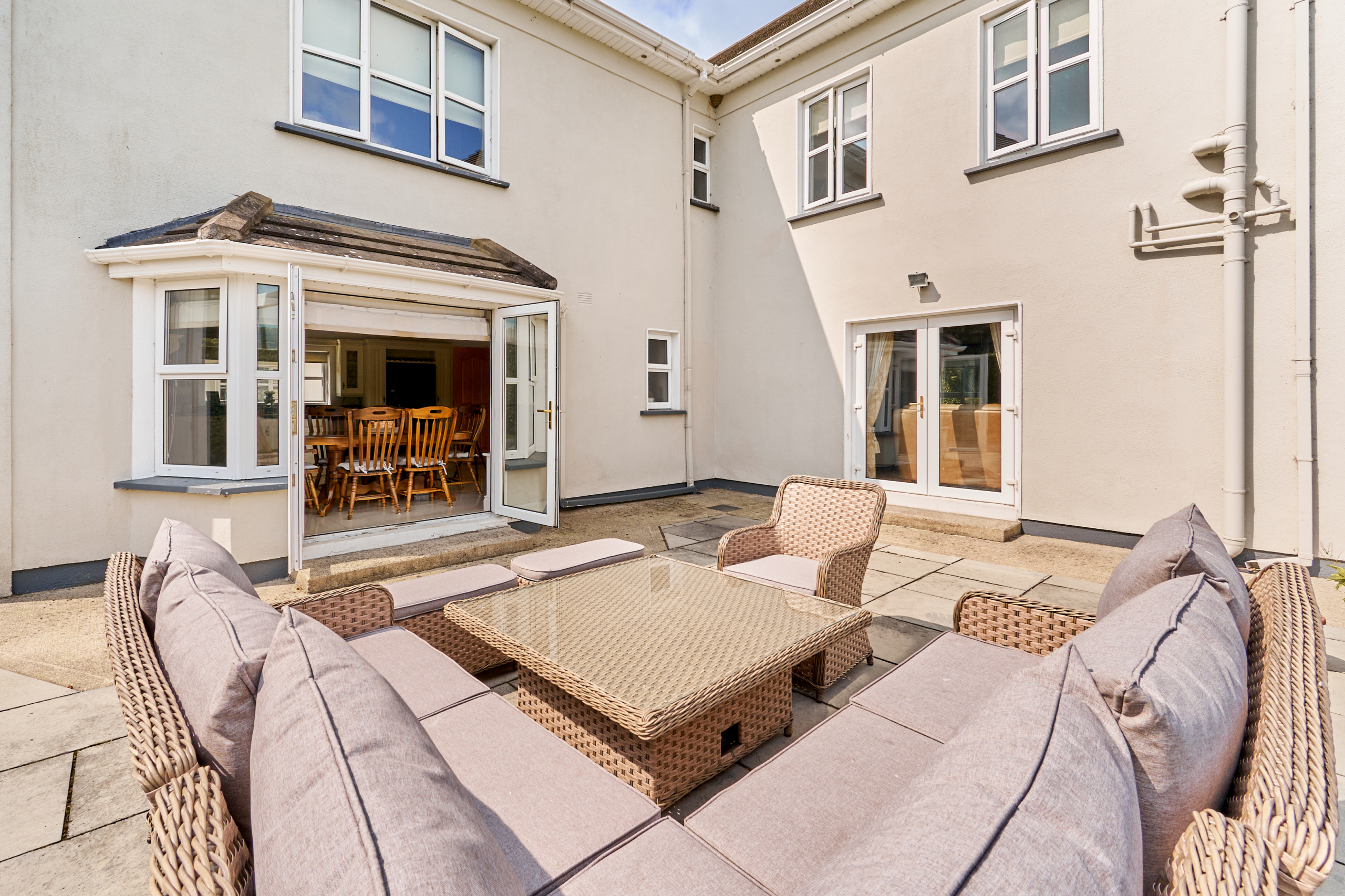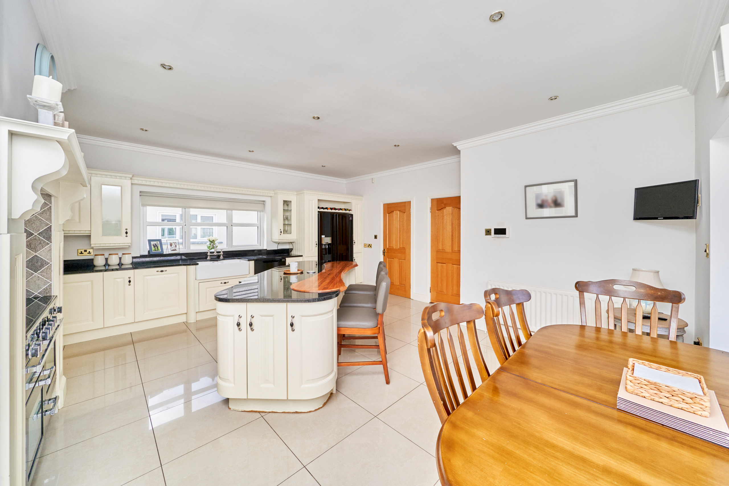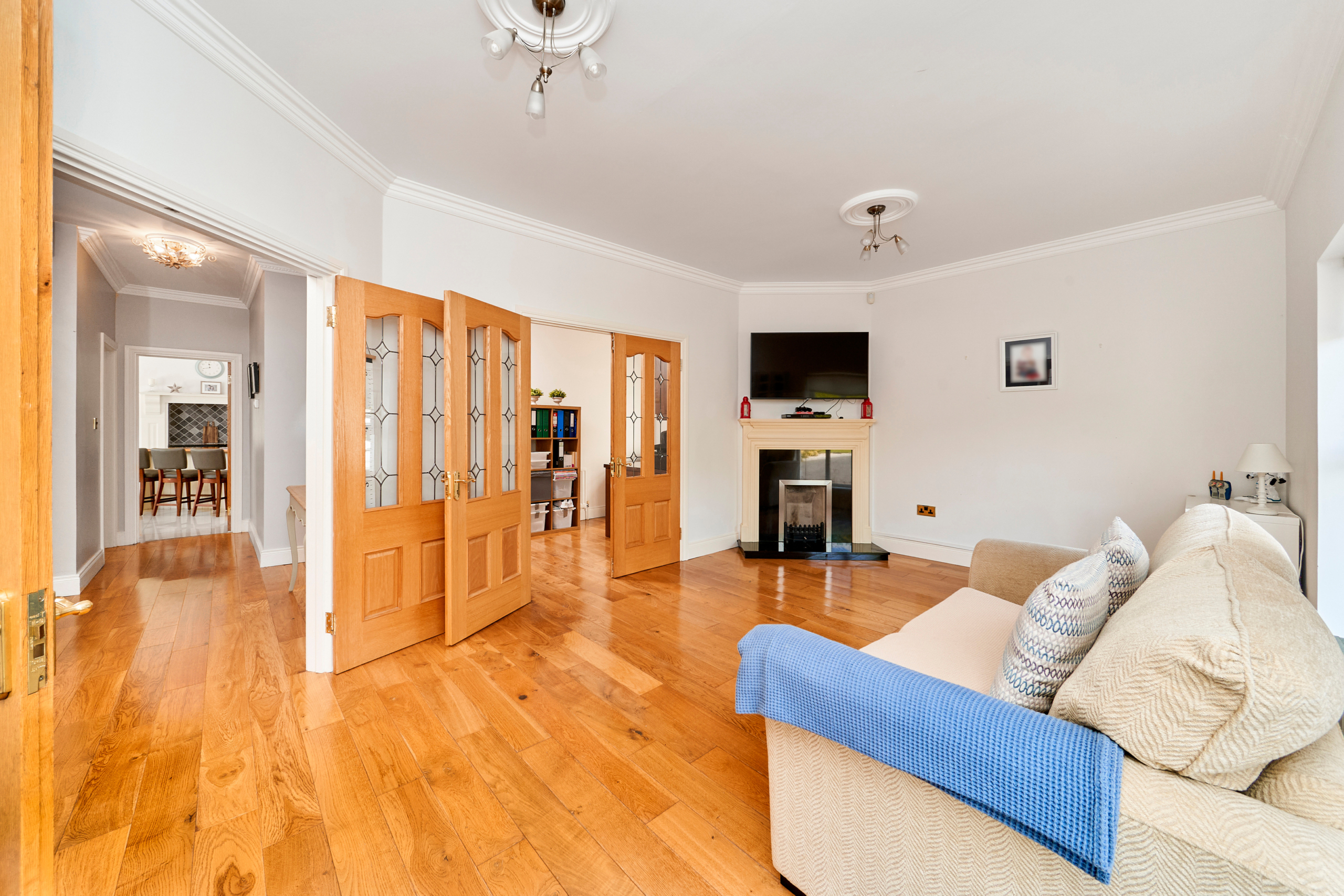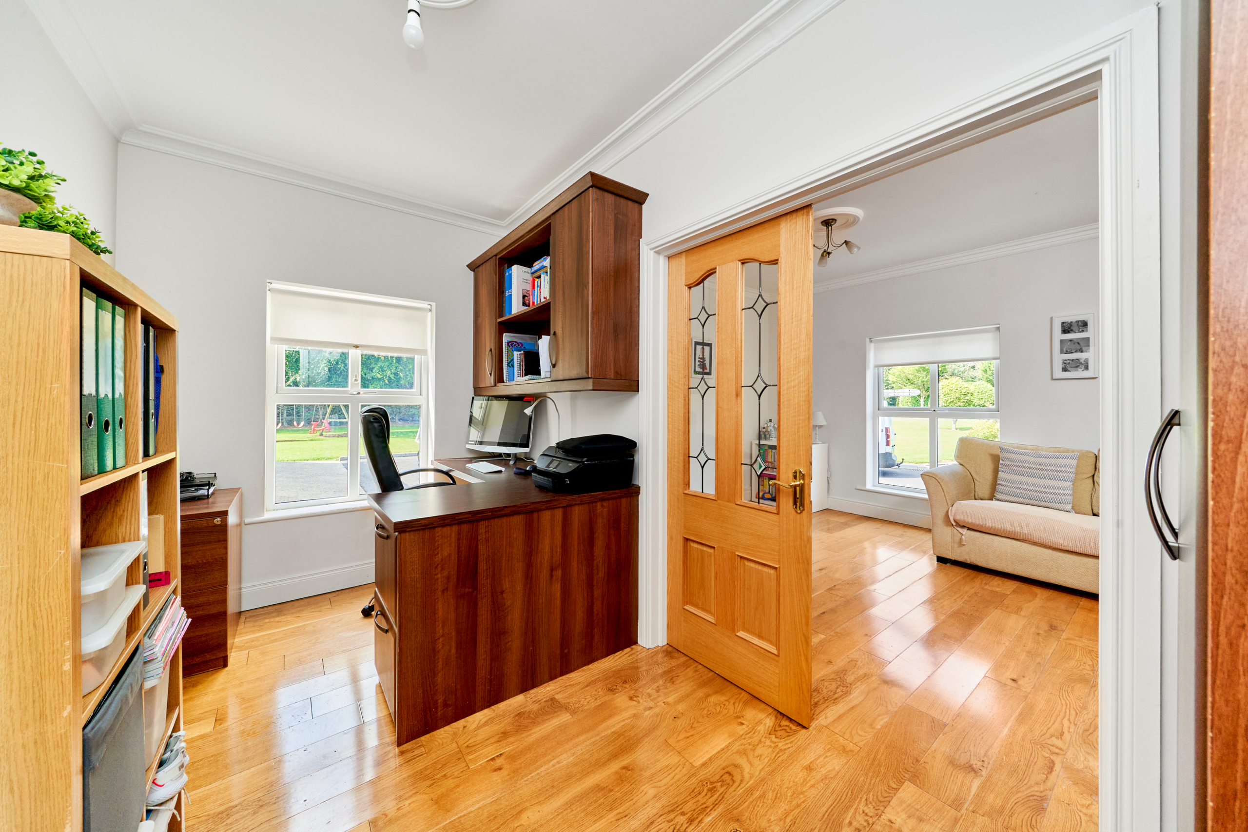 On entering this charming home, the spacious reception hall sets the tone and gives a flavour of what is on offer inside, with solid oak flooring and tasteful decor. Double doors lead to a large sitting room on the left, overlooking the front gardens and with French doors to a paved terrace area. An ideal room for entertaining and enjoying the grounds while alfresco dining.