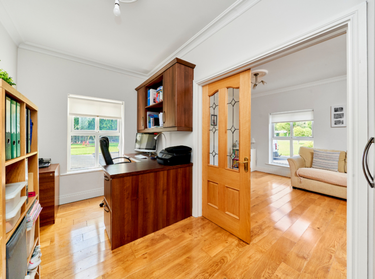 The family/play room is perfect for family life with feature fireplace and views over the front gardens. The home office/study is an ideal work from home space.