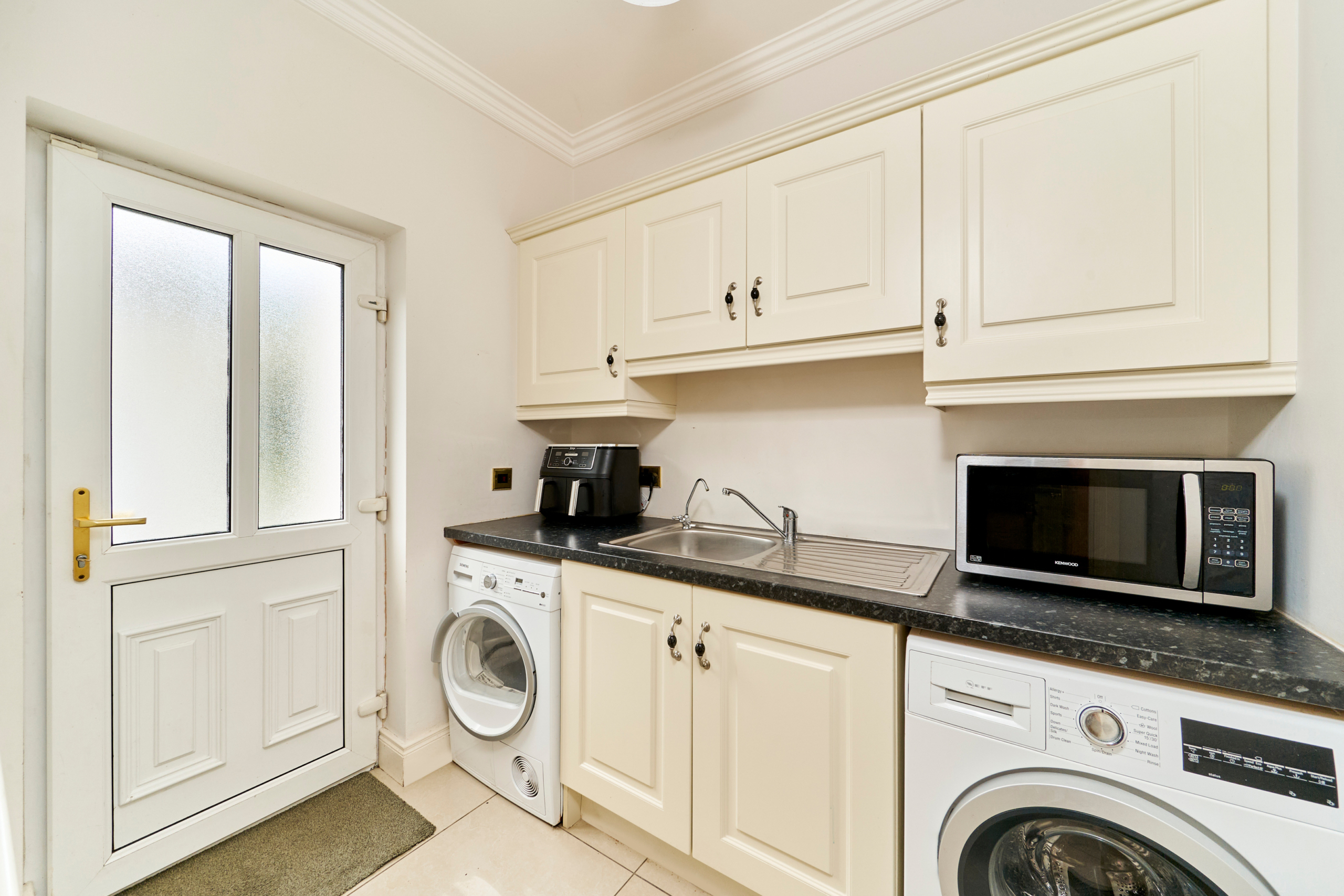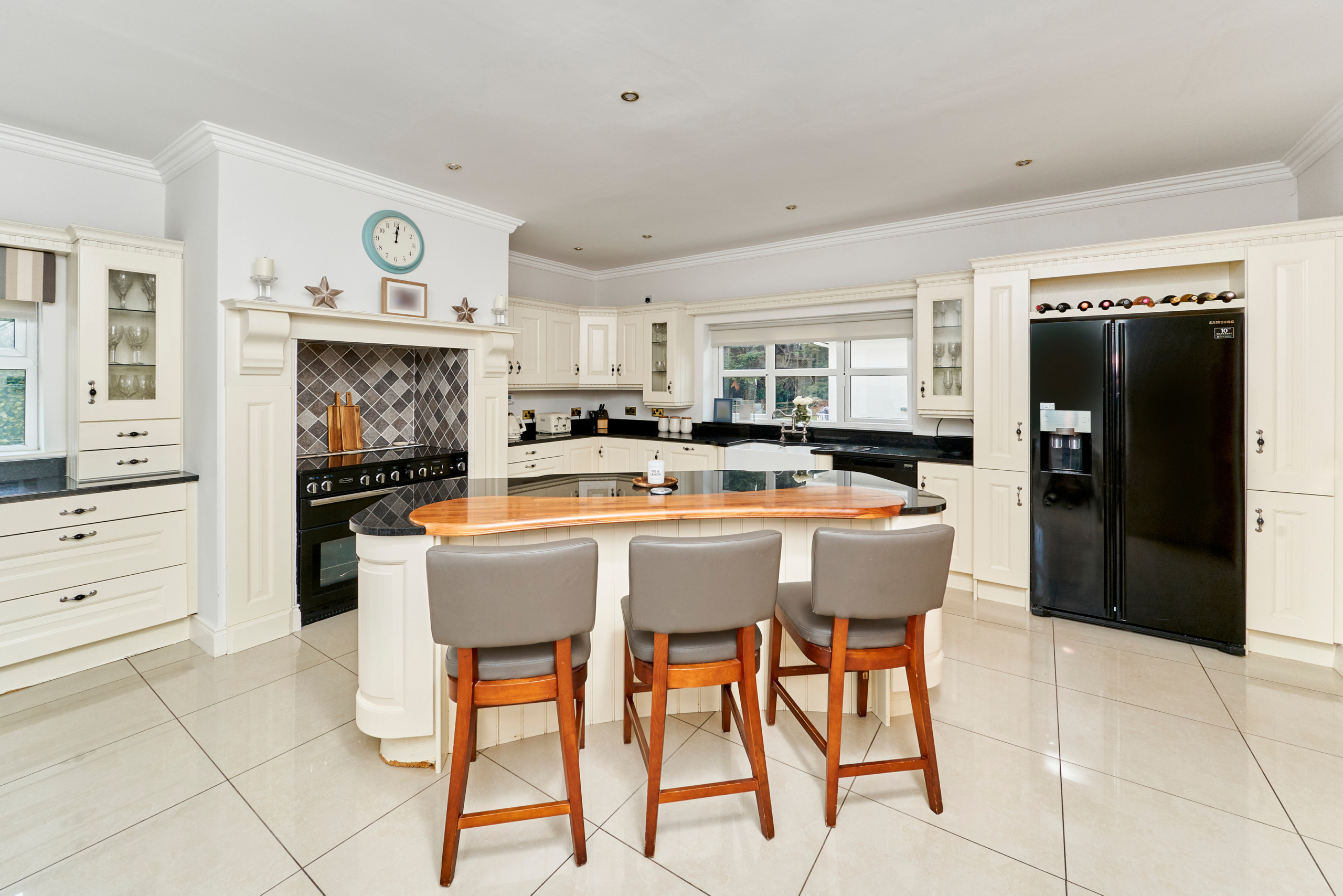 The well laid out and spacious kitchen with an impressive island unit with ample seating space for informal dining, while the fitted units contain all the storage and gadgetry you could hope for. Well equipped with integrated appliances and with views over the rear garden, this is a well-designed kitchen of the highest quality, again with French doors leading out to the paved terrace.